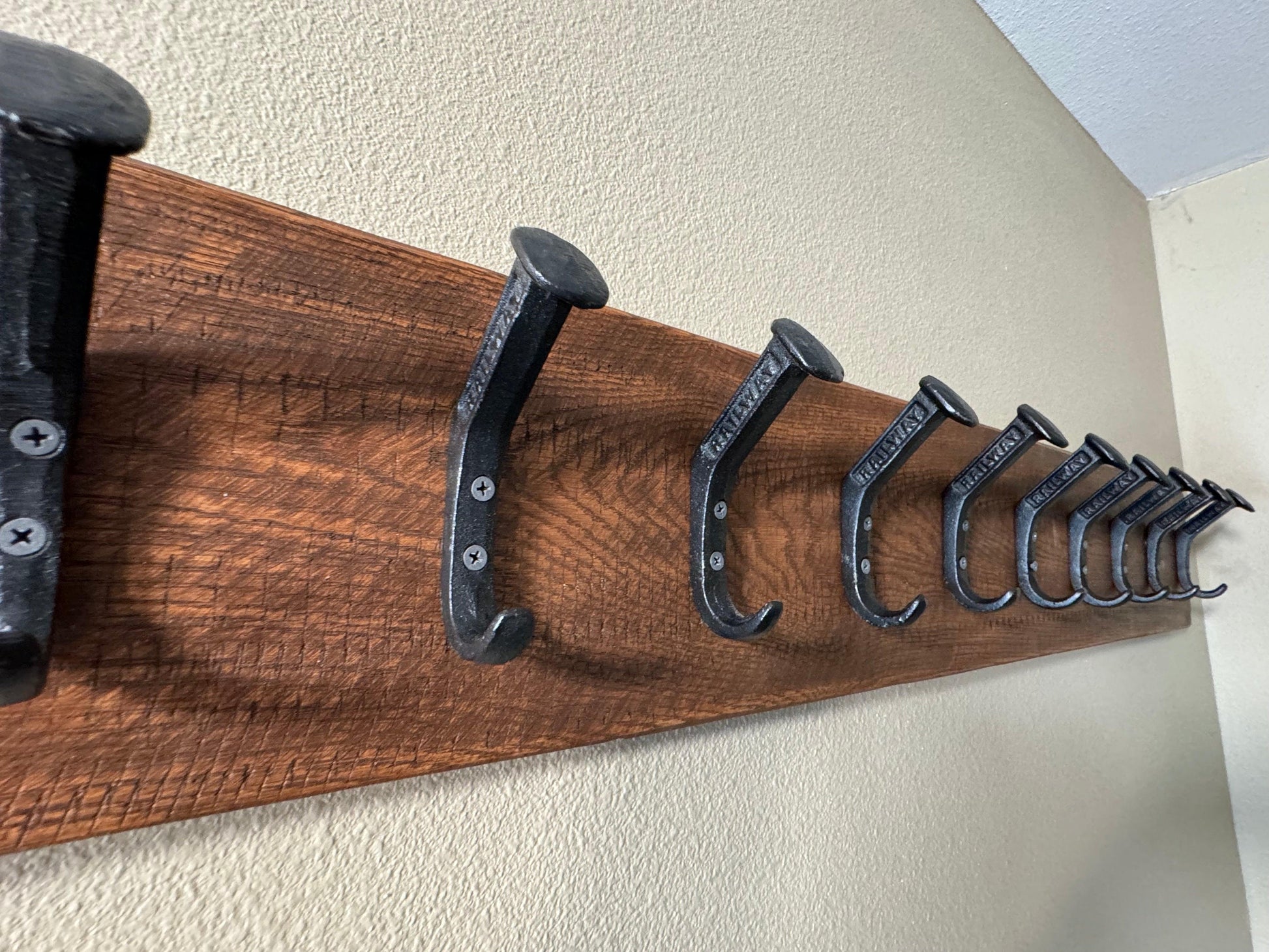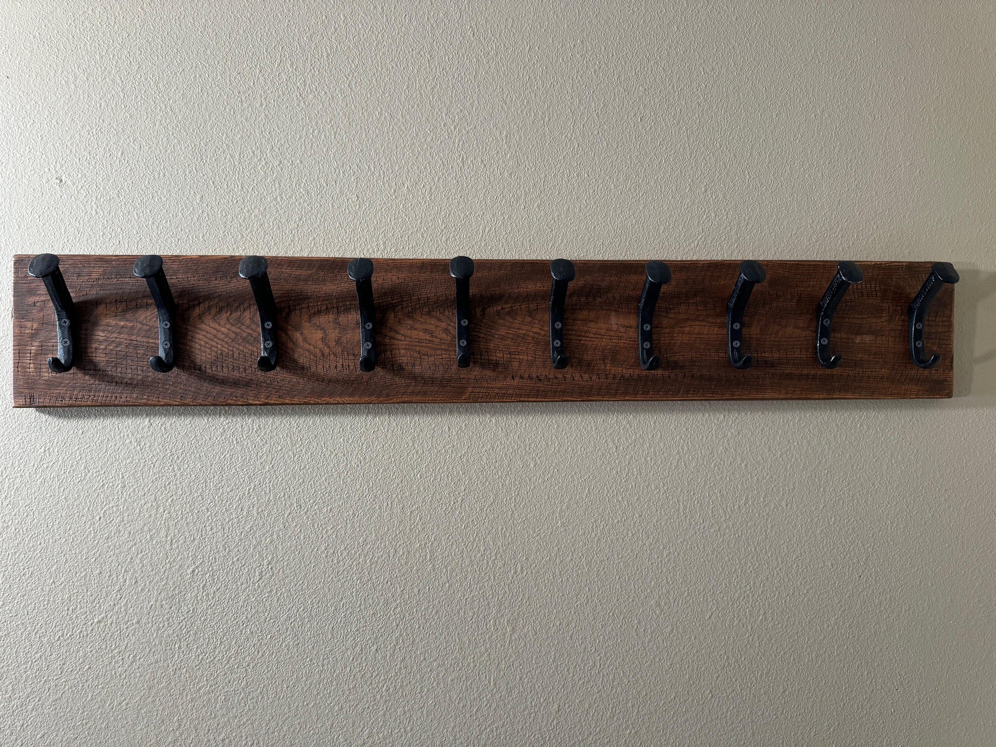 Our popular 10 Hook / 45" Long handmade rustic reclaimed wooden wall rack for hats, caps, & coats features a modern farmhouse design style. This beautiful hand-crafted wood wall rack is made right here in the USA and includes railroad hooks to hold hats / jackets / whatever else :)