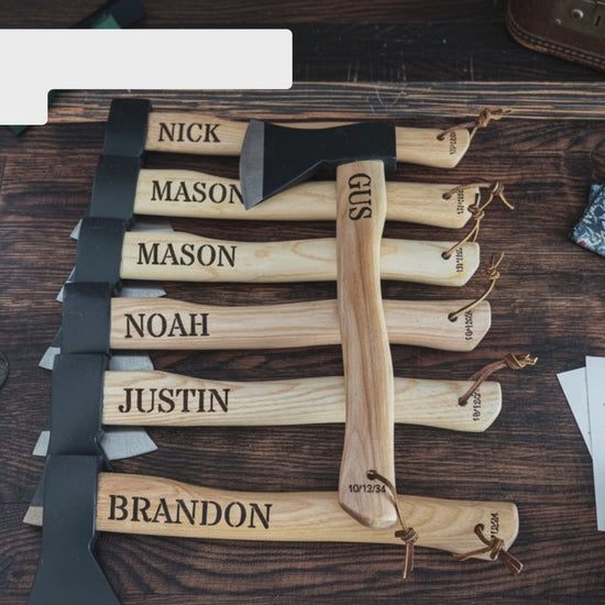 The hatchet is made from strong Hickory wood and has a very sharp high carbon steel head. Hatchet will keep an edge and cut through kindling easily. Great gift for outdoors-man and wildlife explorers. This hatchet can be laser engraved with the last name of your choice.