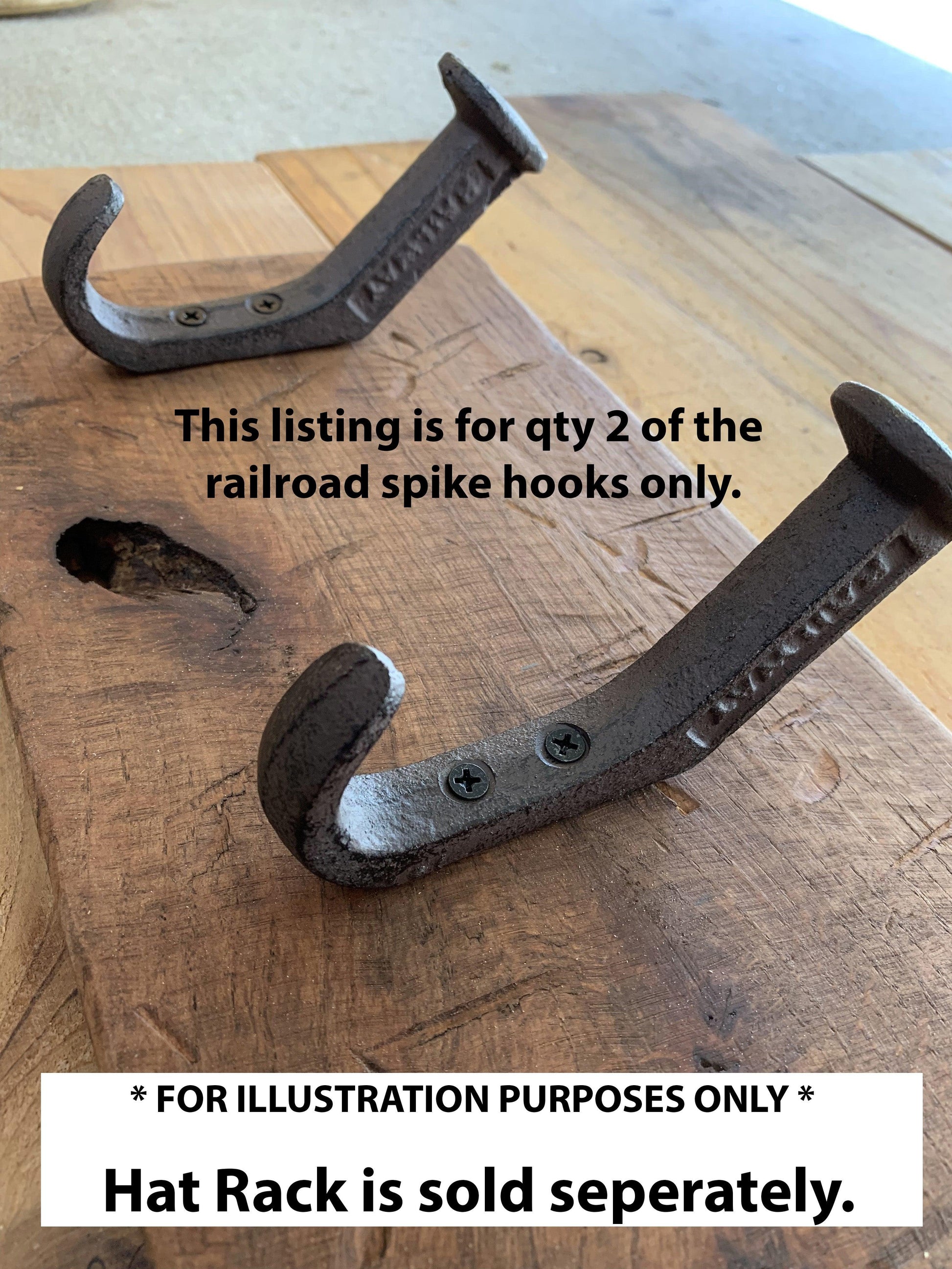 These iron railroad spike wall hangers come in a pack of 2 and are 4.5" tall x 1/2" wide x 2 1/2" deep and will look GREAT in your Entry Way, Living Room, Kitchen, kid's rooms, home office, or your commercial business space.