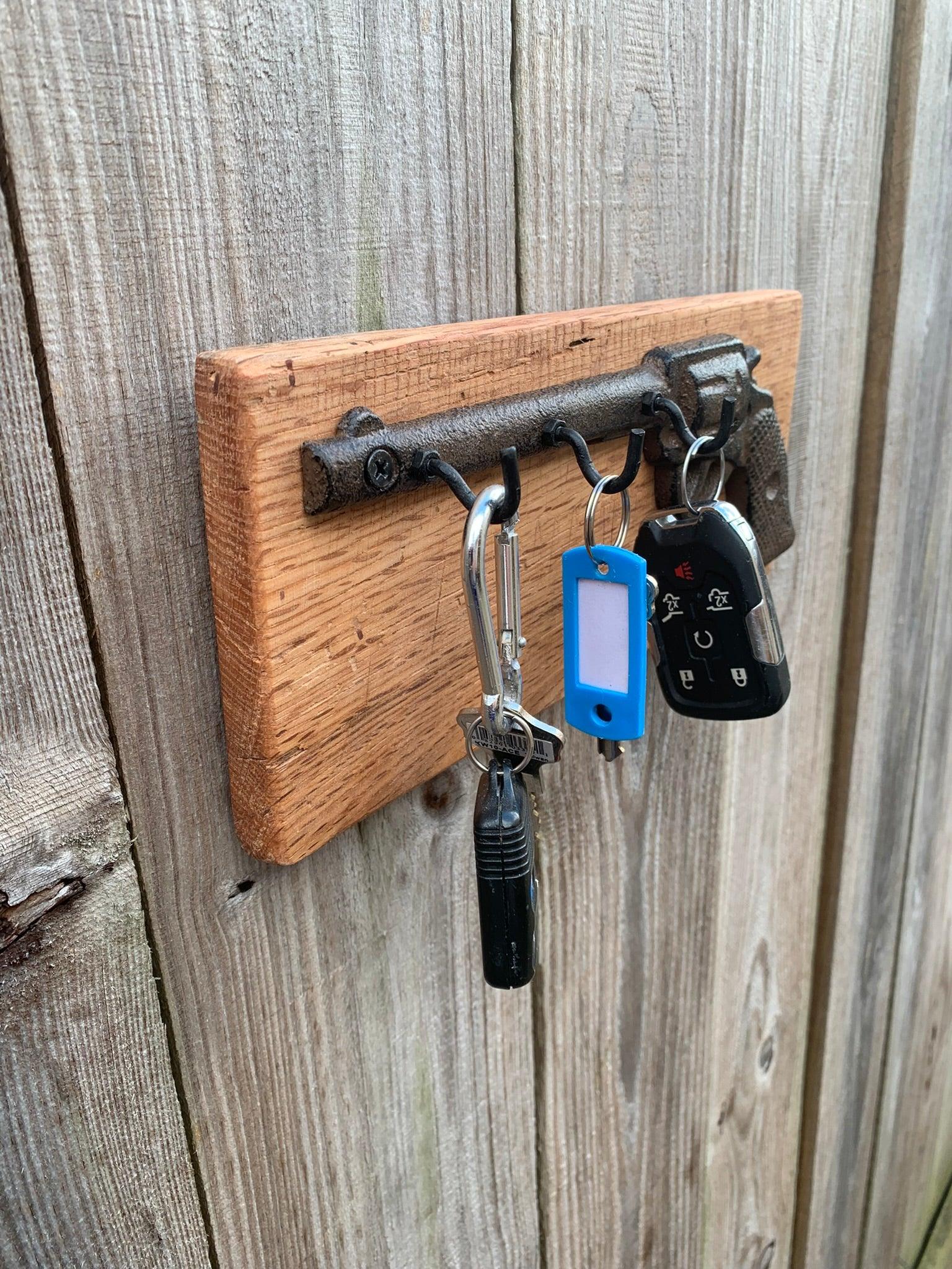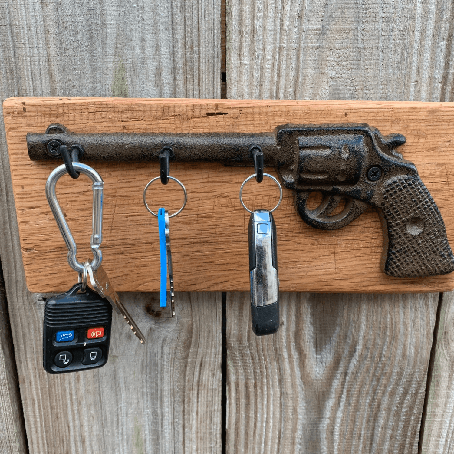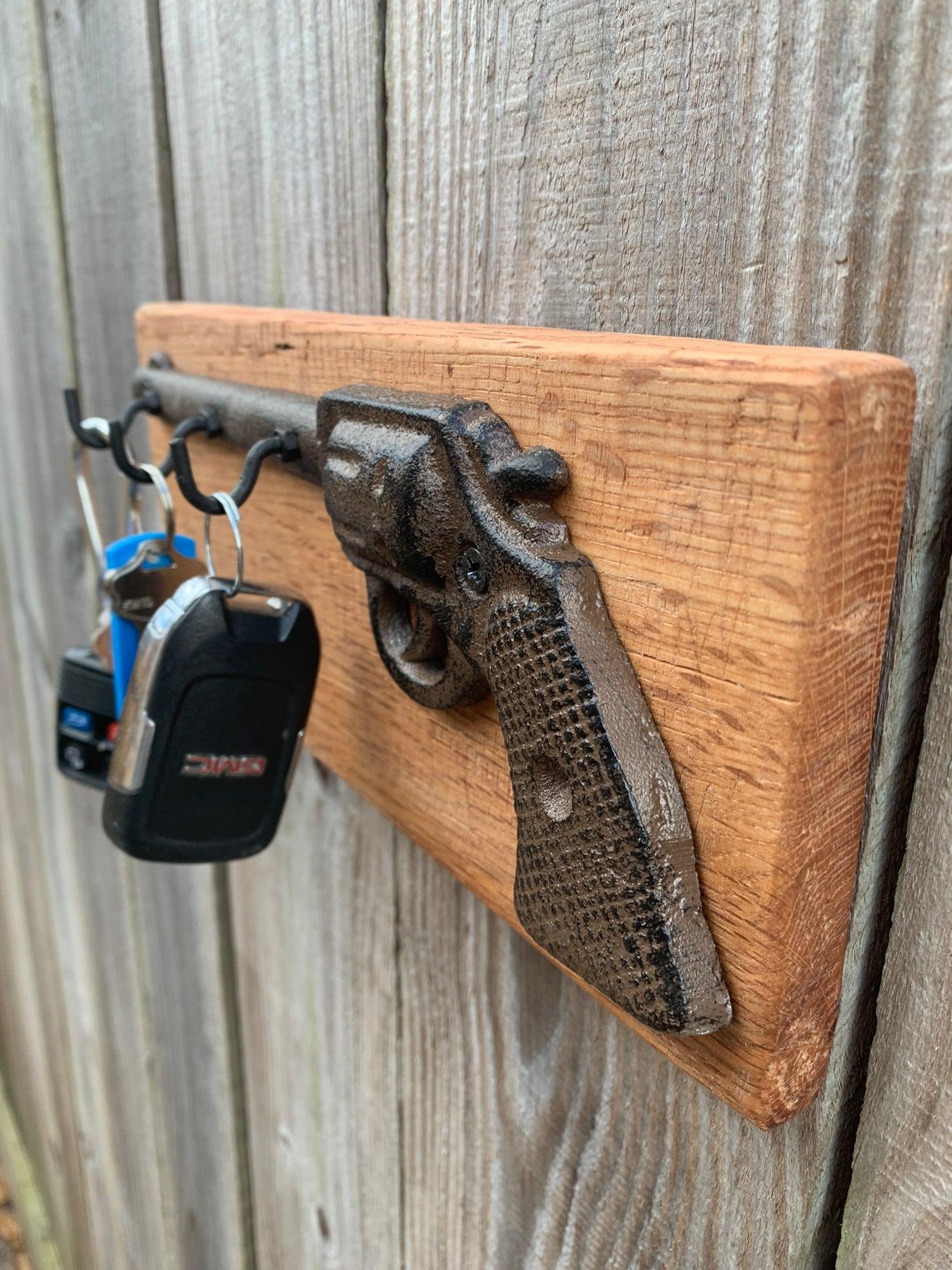 If you love rustic decor with a touch of Farmhouse/Cowboy style, then you'll LOVE this unique vintage pistol keychain holder.