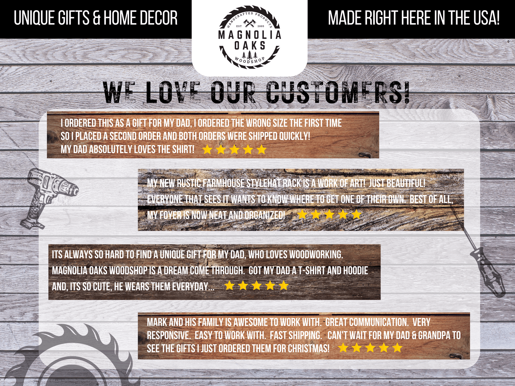 We only use old-growth white oak hardwood harvested by hand in the backwoods of South Mississippi and so you know that your hat rack will be unique, beautiful, and unlike any others.