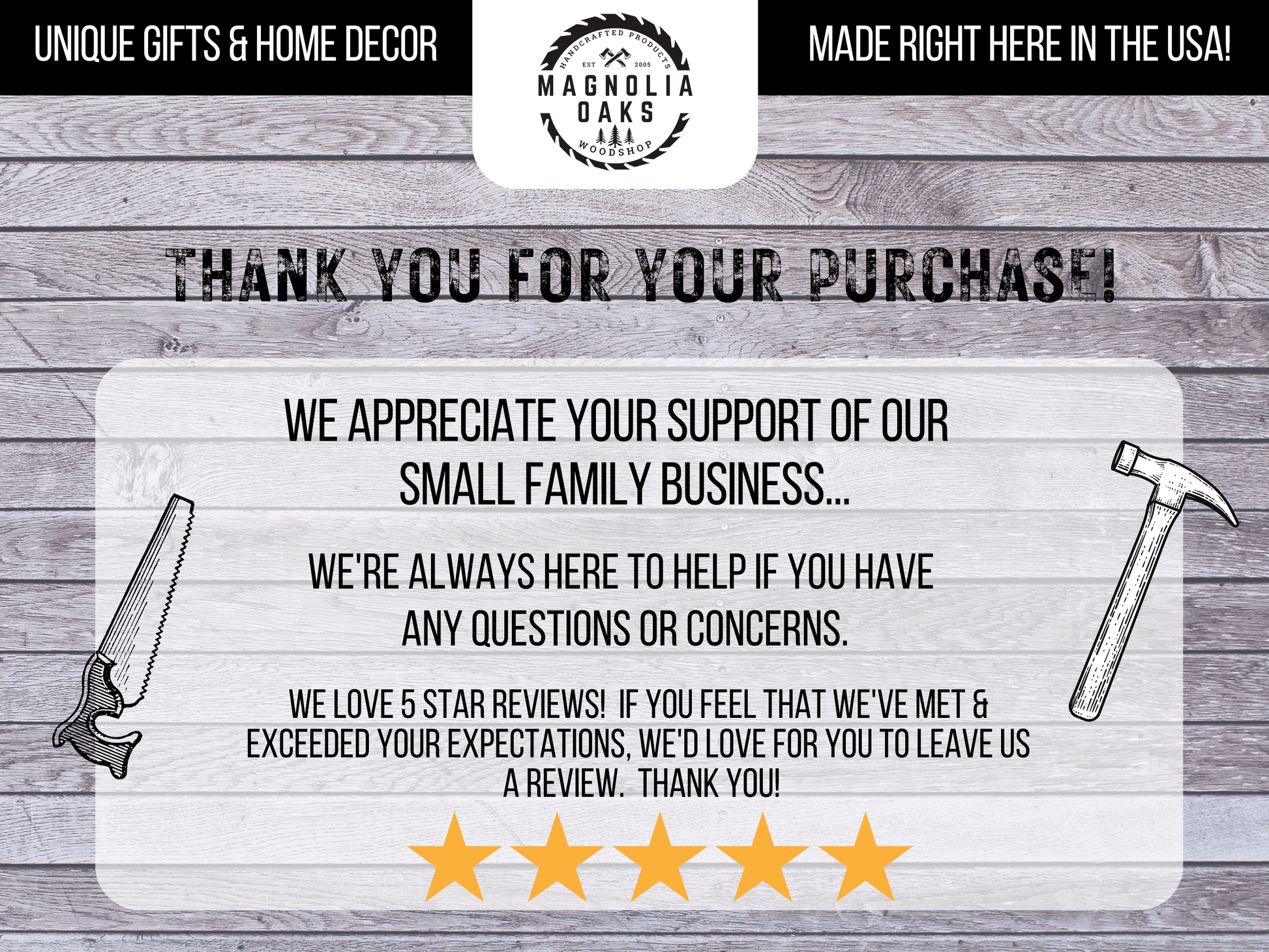 THANK YOU FOR SUPPORTING SMALL AMERICAN BUSINESSES LIKE OURS!We're proud to make our products right here in the USA and we're committed to supporting USA businesses, just like you!