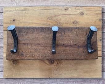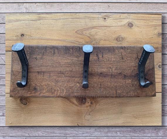 Our popular rustic modern farmhouse handcrafted wooden hat rack includes 3 iron railroad tie hangers and holds 6+ Hats.