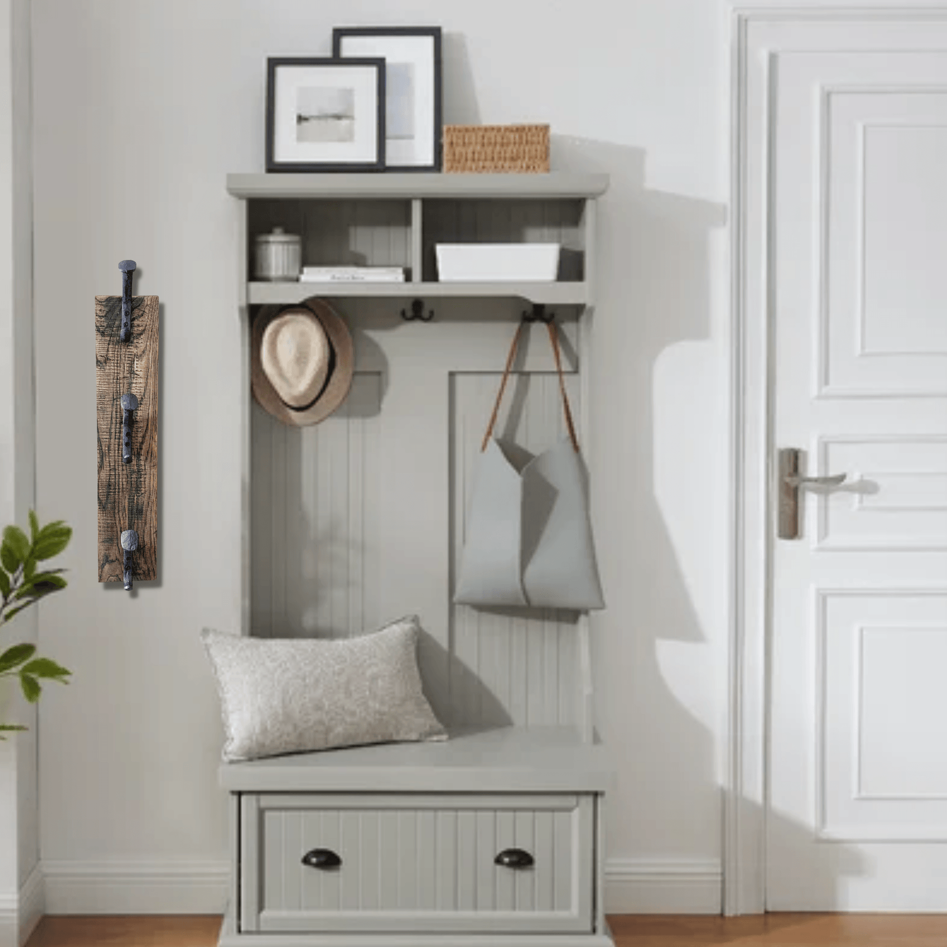 Best of all, it includes 3 awesome-looking (& authentic) railroad stake hooks that are made to hold up to 6 bags, hats, jackets, or whatever you want!